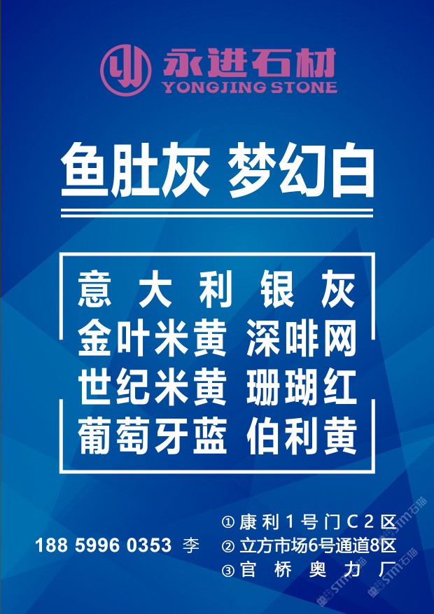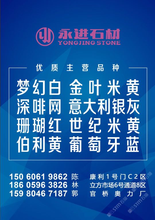 永進(jìn)石材主營:魚肚灰,夢幻白,土耳其愛馬仕灰,意大利銀灰,金葉米黃、深啡網(wǎng)、世紀(jì)米黃、珊瑚紅、伯利黃、葡萄牙藍(lán);