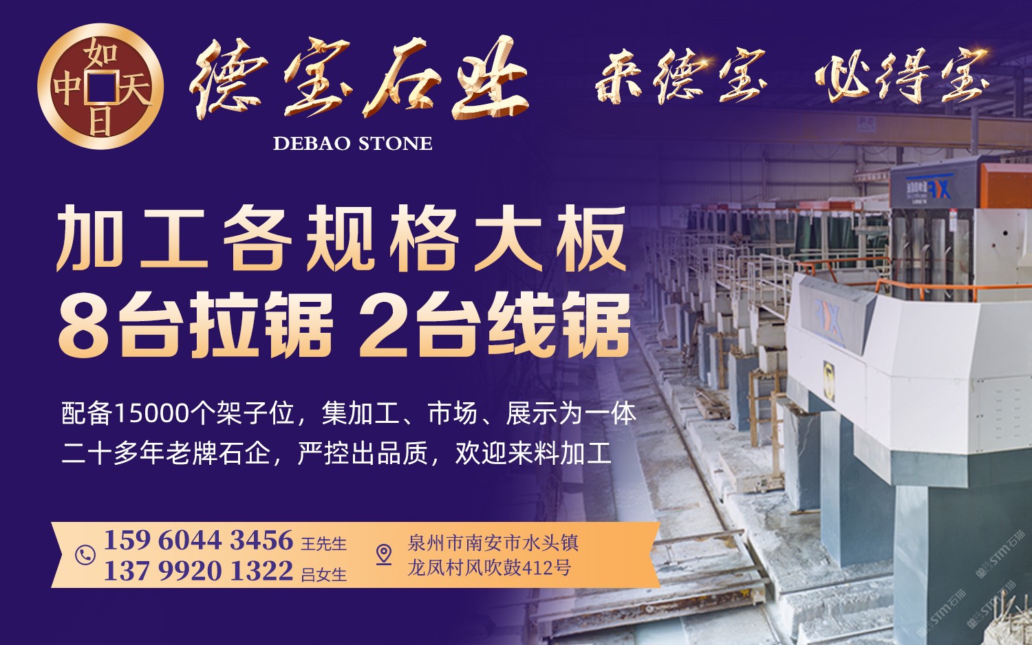德寶大理石專業(yè)加工各規(guī)格大板,8臺拉鋸2臺線鋸,配備15000個架子位,是一家集加工、市場、展示為一體的二十多年老牌石企,嚴控出品質(zhì),歡迎來料加工!