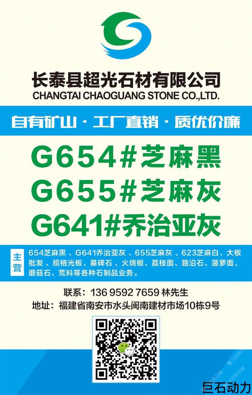 超光石材主營:654芝麻黑 、G641喬治亞灰 、655芝麻灰 、623芝麻白,大板批發(fā) 、規(guī)格光板、墓碑石 、火燒板、荔枝面、路沿石、菠蘿面、蘑菇石、荒料等各種石制品業(yè)務(wù)
