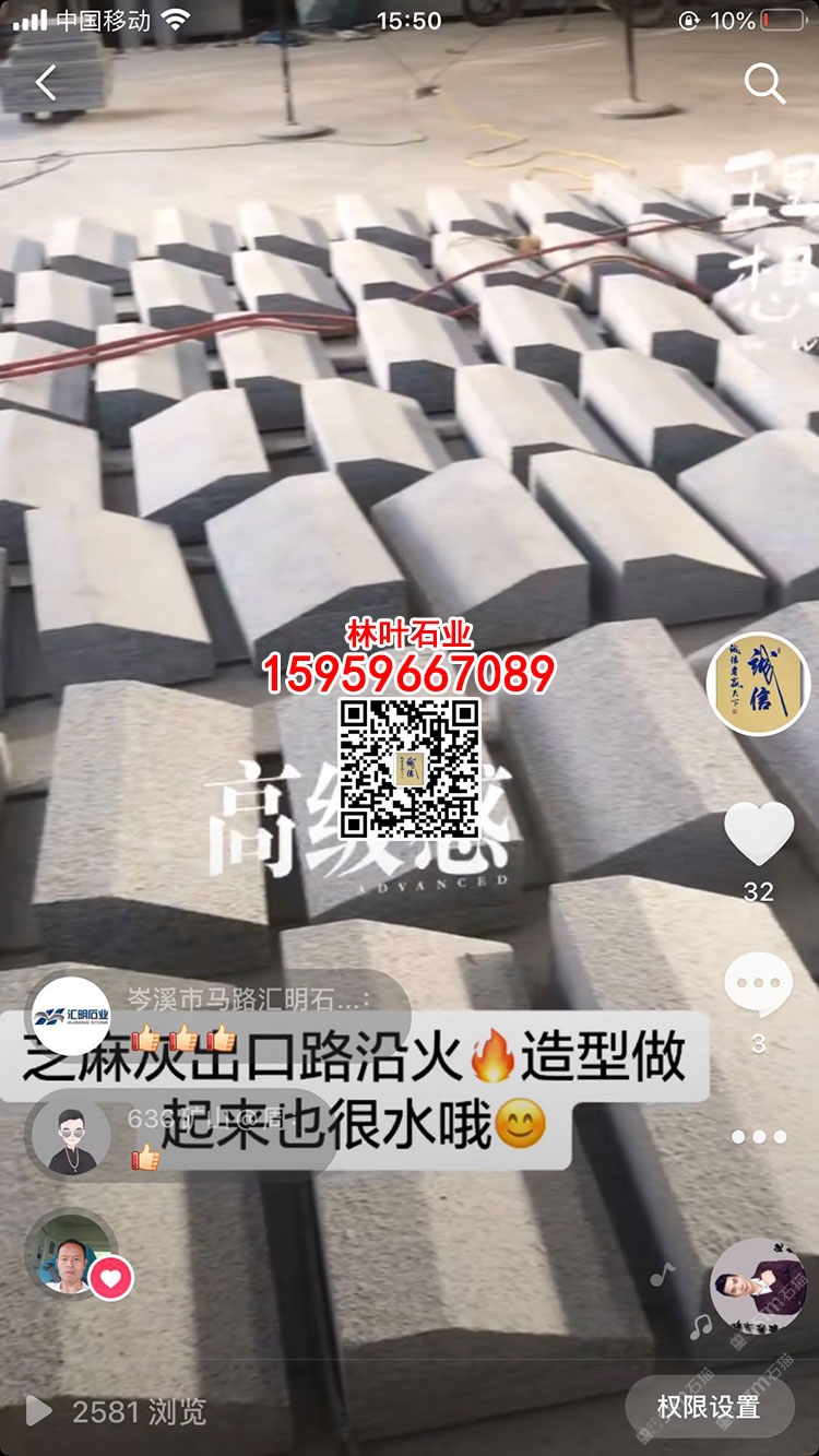 發(fā)布信息: 林葉石業(yè)長泰工廠(林總15959667089微信同號)專業(yè)老礦芝麻黑與芝麻灰供應(yīng)商,專注于出口及高品質(zhì)工程國內(nèi)外園林景觀石材;主營:老礦芝麻黑墓碑石、正礦吳田山G654窗臺板、G654芝麻黑牛鼻子、芝麻黑石材游泳池蓋板、老礦芝麻黑出口高品質(zhì)工程板、老礦654小方塊馬蹄石、芝麻灰G655路沿石、深灰麻石材、中灰麻石材、深灰色花崗巖、黑色麻石等光面、燒面、荔枝面、墓碑石材、地鋪石材、園林景觀工程、路沿石材等;林葉石業(yè)寧德工廠(葉總18050650127微信同號)專業(yè)新礦芝麻黑寧德小藍(lán)寶,廠礦一體,體格優(yōu)惠,真誠希望您的光臨與合作?。暶魃蟼鳟a(chǎn)品圖片均是本廠加工生產(chǎn))