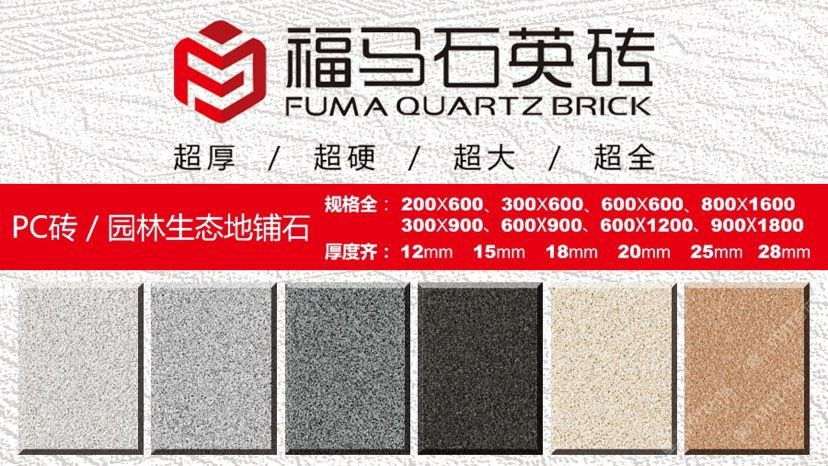發(fā)布信息: ??福馬石英磚 ? 生態(tài)地鋪石創(chuàng)意源自于天然石材,品質(zhì)勝于天然石材。 以天然石粉、高嶺土、石英砂、長(zhǎng)石等原料,經(jīng)研磨、混合制漿、干燥噴粉、壓制、多層施釉、燒結(jié),1250℃高溫使原材料產(chǎn)生熔融狀態(tài),冷卻后重組結(jié)晶。這使得生態(tài)石更加密實(shí)和堅(jiān)硬。 ? 1、全瓷化通體材質(zhì),高瓷化度,低吸水率,使產(chǎn)品防滑、耐磨、高抗折、高耐污,清潔方便性。 ? 2、依據(jù)天然石材的表面,開具特殊模具表面,使生態(tài)地鋪石具有石材質(zhì)感,仿真度更高,更防滑,不同于普通廣場(chǎng)磚 ? 3、產(chǎn)品表面經(jīng)7道以上特殊釉水工藝處理,使產(chǎn)品具有耐磨、防滑,高耐污,清潔方便的特點(diǎn)。 ? 4、產(chǎn)品顏色豐富(量大可定制),尺寸多樣。能夠配合設(shè)計(jì)師獨(dú)特創(chuàng)意,實(shí)現(xiàn)不同環(huán)境和個(gè)性所要求的裝飾風(fēng)格。 ? 5、耐久性好,適合場(chǎng)所廣。產(chǎn)品具有耐磨抗壓、防滑耐污、耐酸堿、抗凍、不褪色的特點(diǎn)??捎糜诖笮拓涇嚳赏ㄐ械模姓こ?,小區(qū)景觀路面,休閑廣場(chǎng),園林綠化,公園公共停車場(chǎng)等。 ? 6、后期養(yǎng)護(hù)、修補(bǔ)簡(jiǎn)單。產(chǎn)品顏色可控,不同批次產(chǎn)品色差控制在95%左右,且常規(guī)顏色產(chǎn)品,長(zhǎng)期備有庫(kù)存。