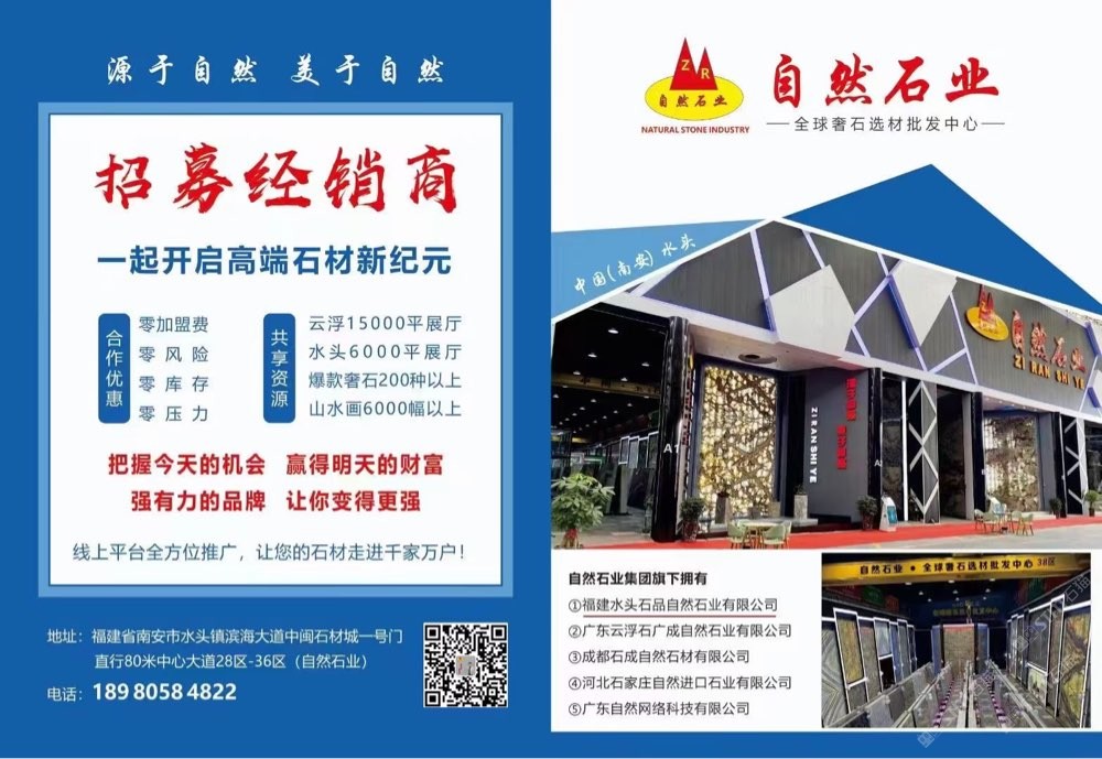 發(fā)布信息: 自然石業(yè)全球奢石批發(fā)中心,招募經(jīng)銷商,無需加盟費,一手貨源,專業(yè)背景墻供應(yīng)廠家。歡迎選購 ??19305059488(微信同號) 主營:潘多拉,新款潘多拉,藍(lán)絲綢,紅絲綢,絲綢之路,魅力人生,蒂芙尼,卡拉白,魚肚白,魚肚灰,盛世紅顏,紅寶石,石榴紅寶,桃李春風(fēng),金枝玉葉。金玉滿堂,金孔雀,孔雀開屏,火樹銀花,潘多拉,維也納,亞馬遜綠,綠翡翠,加雅綠,白色羅馬,藍(lán)色羅馬,羅馬印象,海納百川,春山畫境,冰河世紀(jì),波光靈動,金戈壁玉,天澤玉石,鉑金鉆,翰墨白金,景泰藍(lán),皇家藍(lán),白銀狐,雪山銀狐,雪山蘭,雪山藍(lán),雪山白,山水畫,煙影流香,藍(lán)水晶,紫水晶,加爾達(dá)之晶,龍文綠,竹節(jié)綠,綠斑竹,紫氣東來,千里馬,藍(lán)色精靈,壁山芳華,格蘭云天,香格里拉,夢幻藍(lán)寶,海洋之星,綠野仙蹤,藍(lán)翡翠,自然白,羅馬灰,白底潘多拉等產(chǎn)品!有單你來談,價格好商量! 中閩石材城28區(qū)-36區(qū)(一號門直走一百米左手邊)