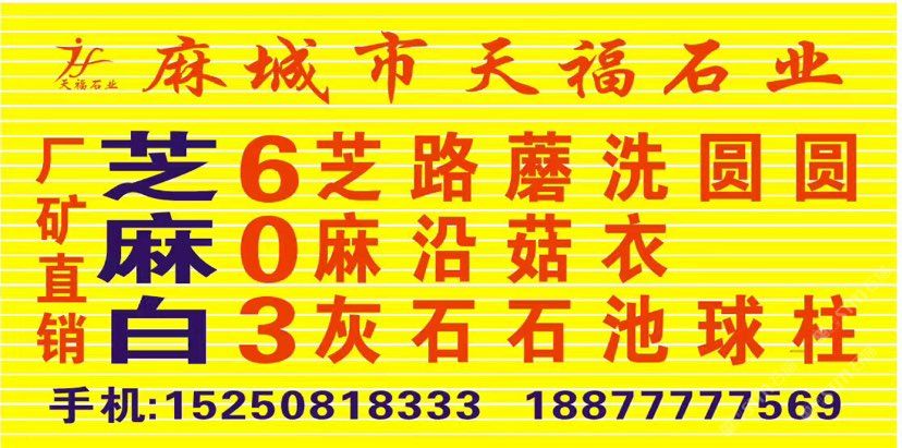 發(fā)布信息: 天福石業(yè)【主營經(jīng)營】芝麻白(603#)、卡麥黃.602#.芝麻灰、銹石、黃金麻、卡拉麥里金·毛板、光板、火燒板,荔枝面成品板及臺階石、蘑菇石~路沿石、擋車石,圓球.圓柱.異形、仿形加工工藝品等。適合用于各種場合, 優(yōu)質(zhì)礦山資源以質(zhì)量求生存、以信譽(yù)求發(fā)展。聯(lián)系電話:15250818333